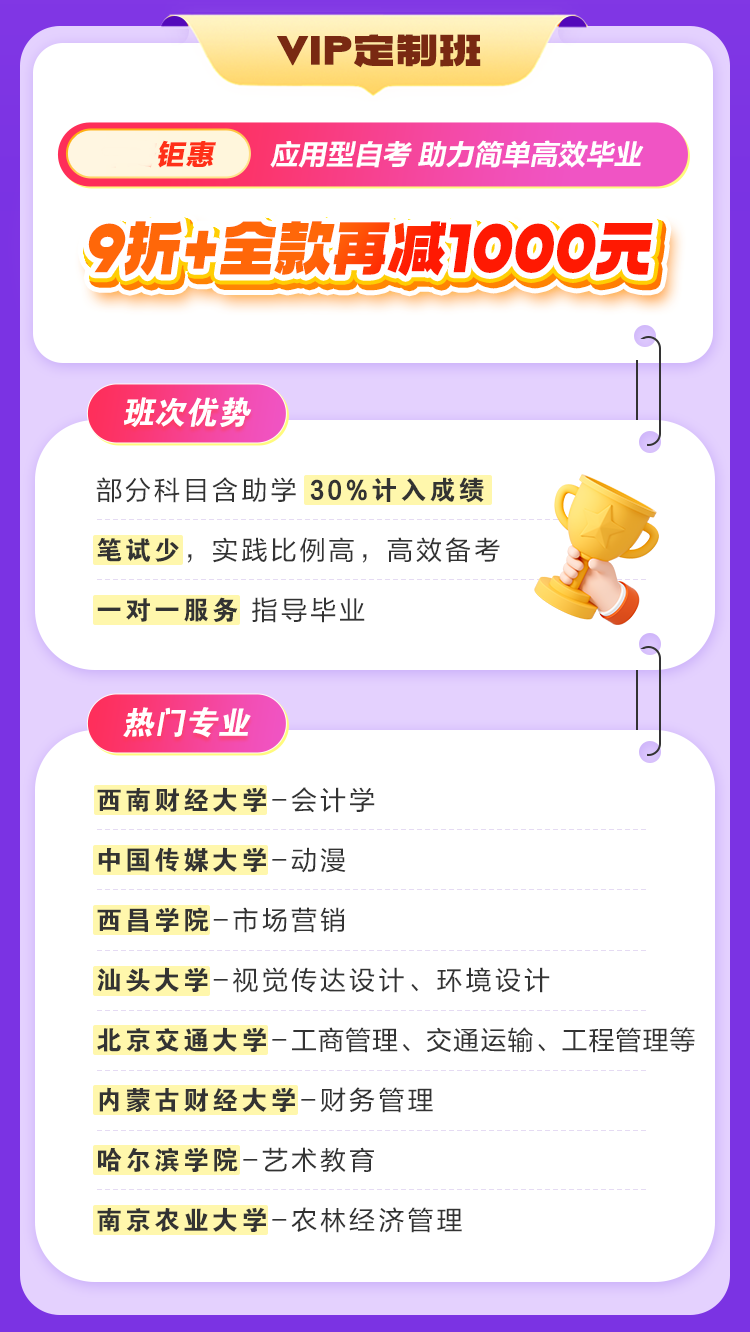 1月课程优惠:自考VIP班享9折优惠 全款支付再减1000元